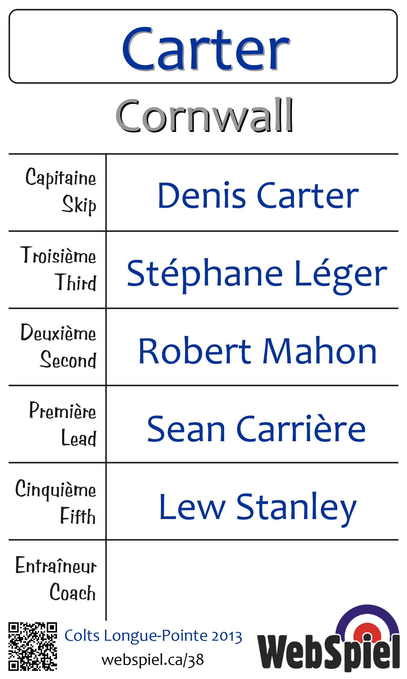 | Club | Cornwall Cornwall Curling Centre 220 Water St. E., PO Box 803 Cornwall, ON K6H 5T7 CANADA T: +1-613-936-2027 http://www.cornwallcurling.ca/ 6 glaces |