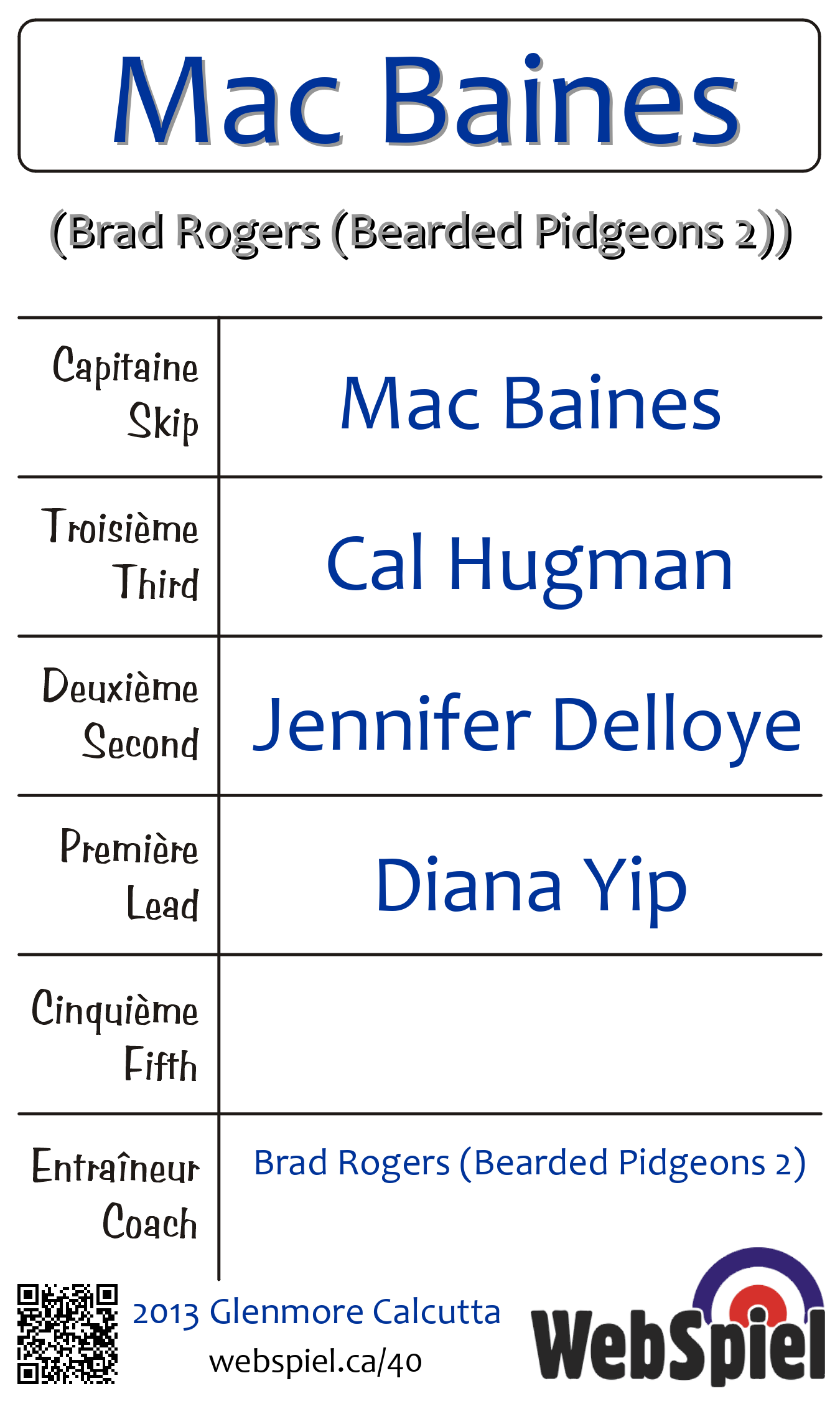 | Club | (Brad Rogers (Bearded Pidgeons 2)) Glenmore Curling Club 120 rue Glenmore Dollard-des-Ormeaux, QC H9B 2X9 CANADA T: 514-684-6350 F: 514-684-6352 http://www.glenmorecurling.com 4 glaces |