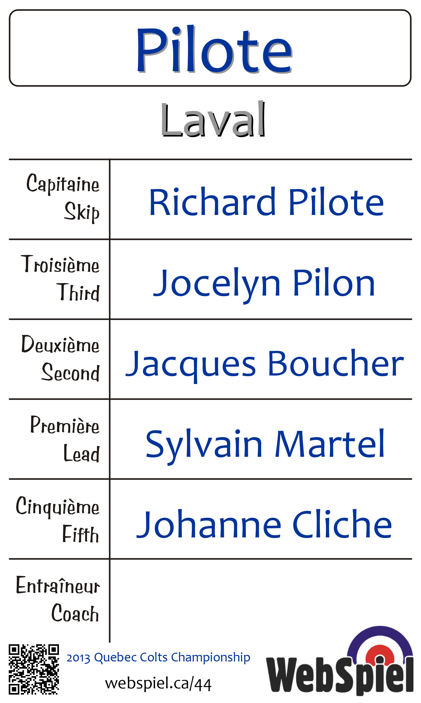 | Club | Laval Club de curling Laval-sur-le-Lac 10 rue les Pins Laval-sur-le-Lac, QC H7R 1C7 CANADA T: 450-627-4791 F: 450-627-7511 http://www.curlinglaval.ca 3 glaces |