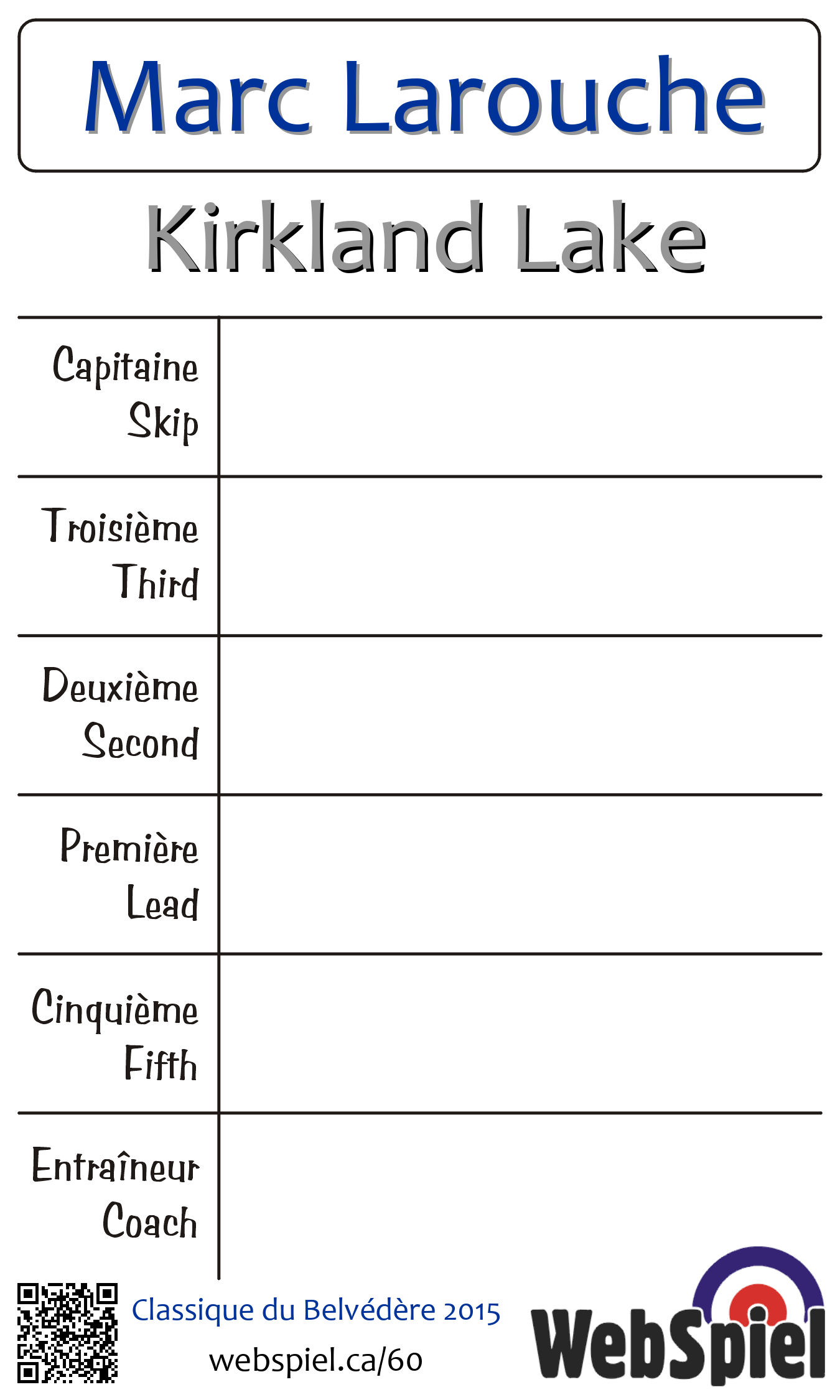 Dimanche le 22 février 2015, à 13h00 EST Club de curling du Belvédère, Glace 2 · B, Gagnant › B08, Perdant › Éliminé | |||||||||
