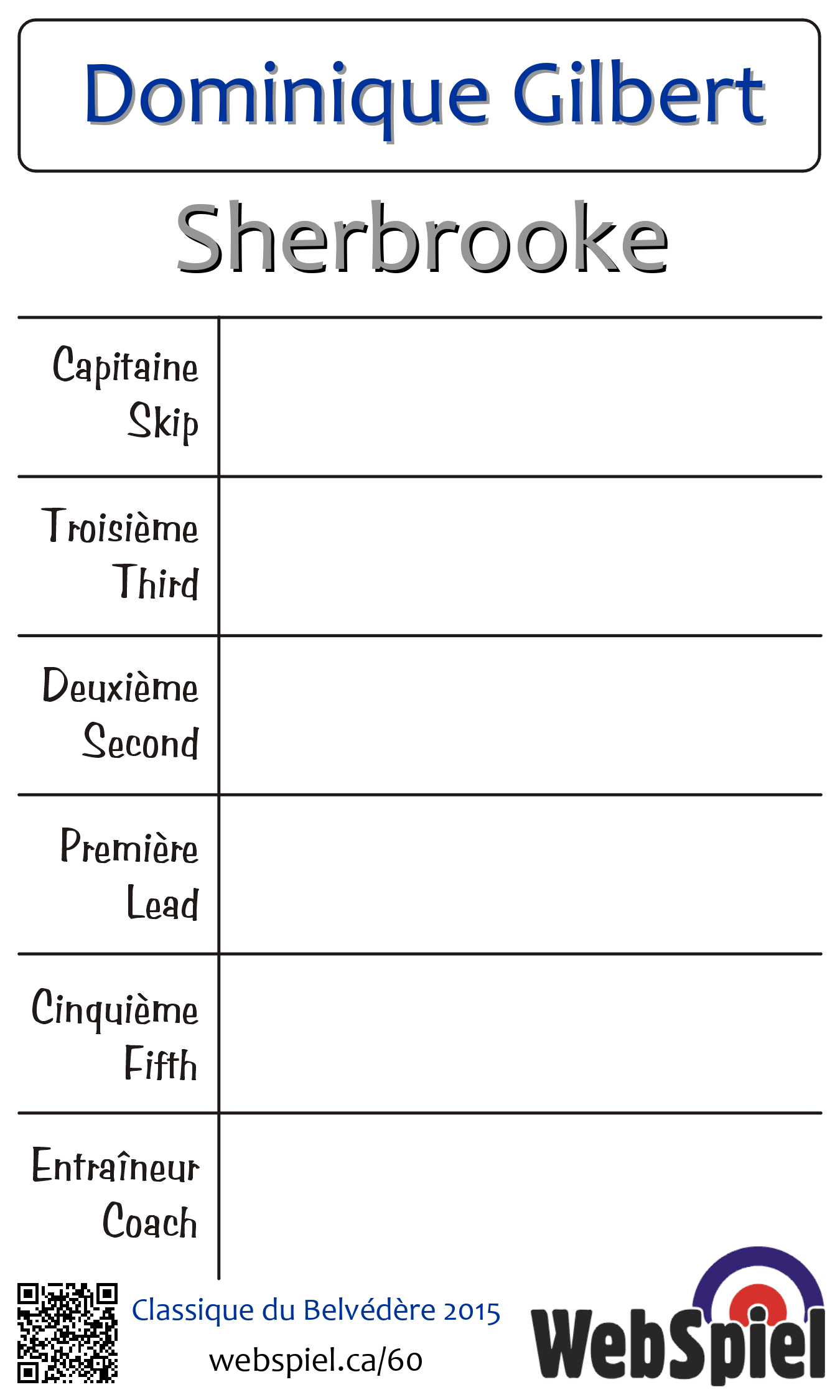 | Club | Sherbrooke Club de curling Sherbrooke 83 rue Abénaquis C.P. 682 Sherbrooke, QC J1H 1H1 CANADA T: 819-562-8222 |