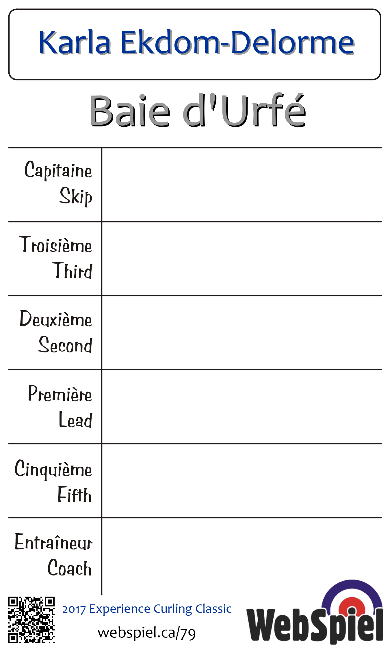 Samedi le 11 novembre 2017, à 17h00 EST Baie d'Urfé Curling Club, Glace 192 | |||||||||