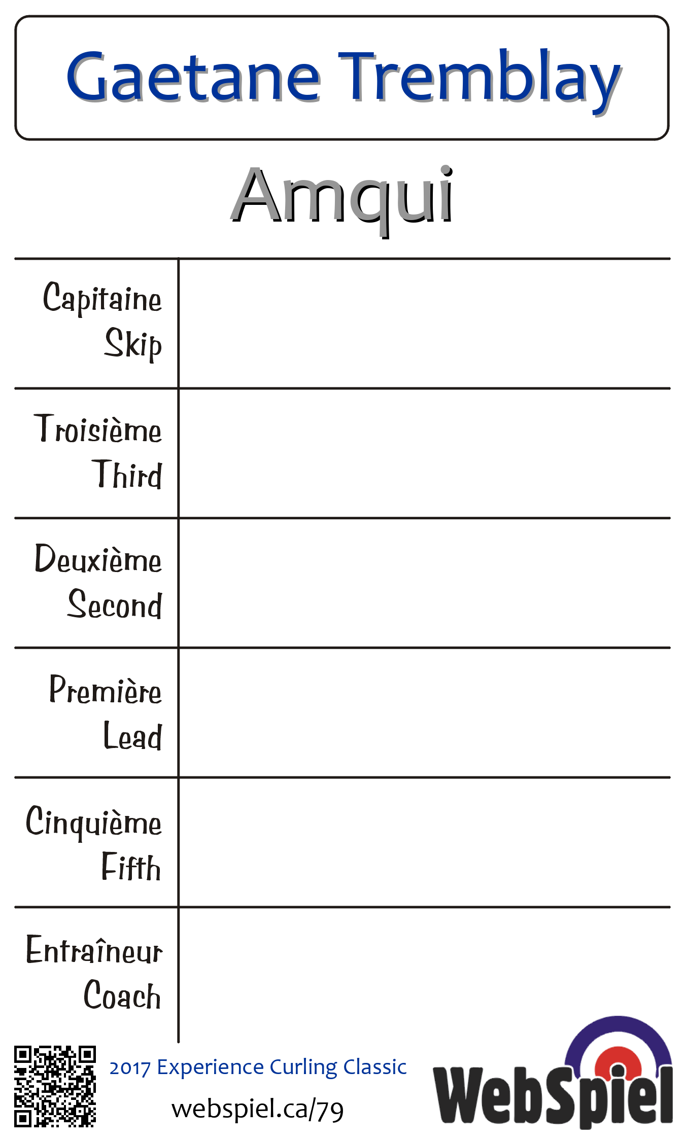 Samedi le 11 novembre 2017, à 17h00 EST Baie d'Urfé Curling Club, Glace 192 | |||||||||