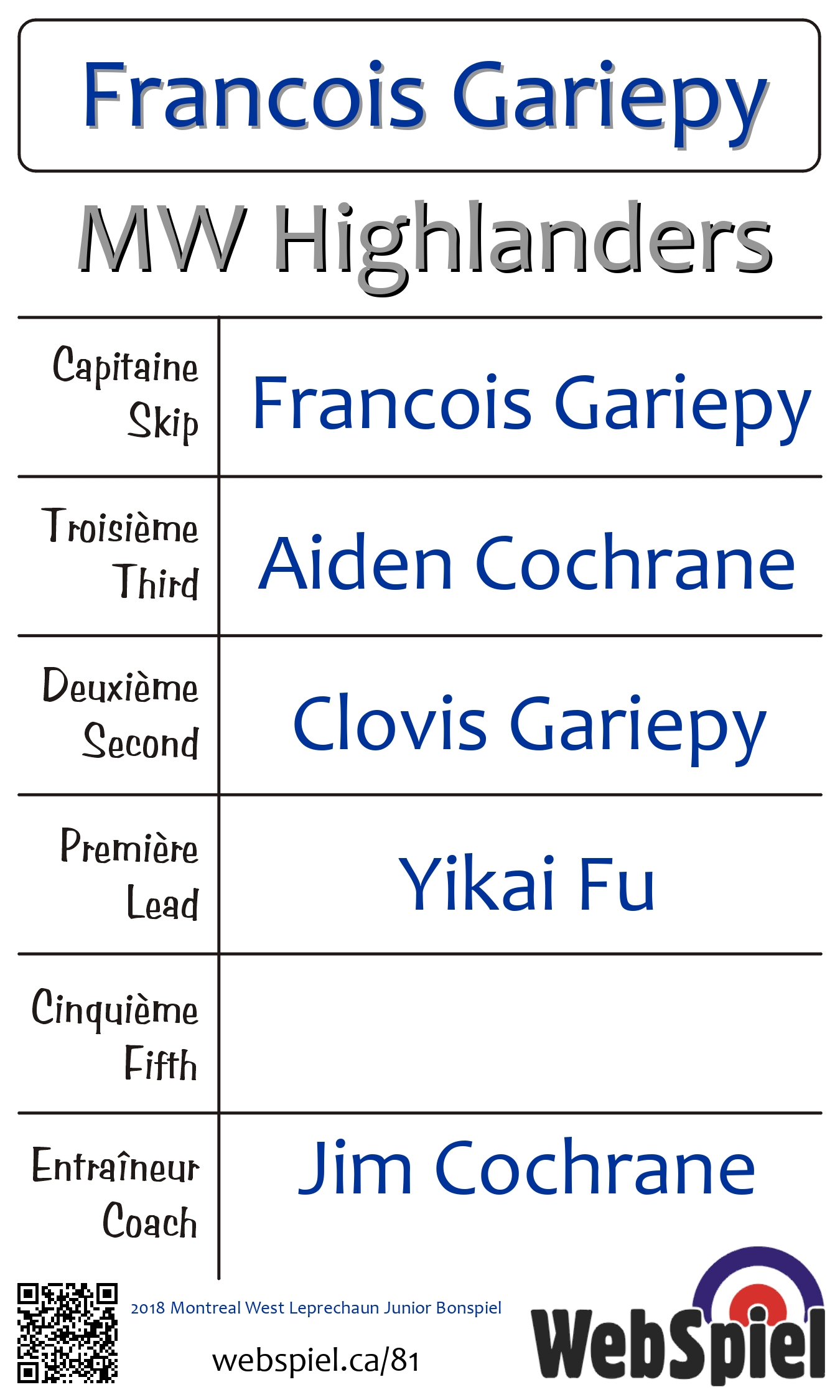 Vendredi le 26 janvier 2018, à 18h00 EST Montreal West Curling Club, Glace 74 | |||||||||