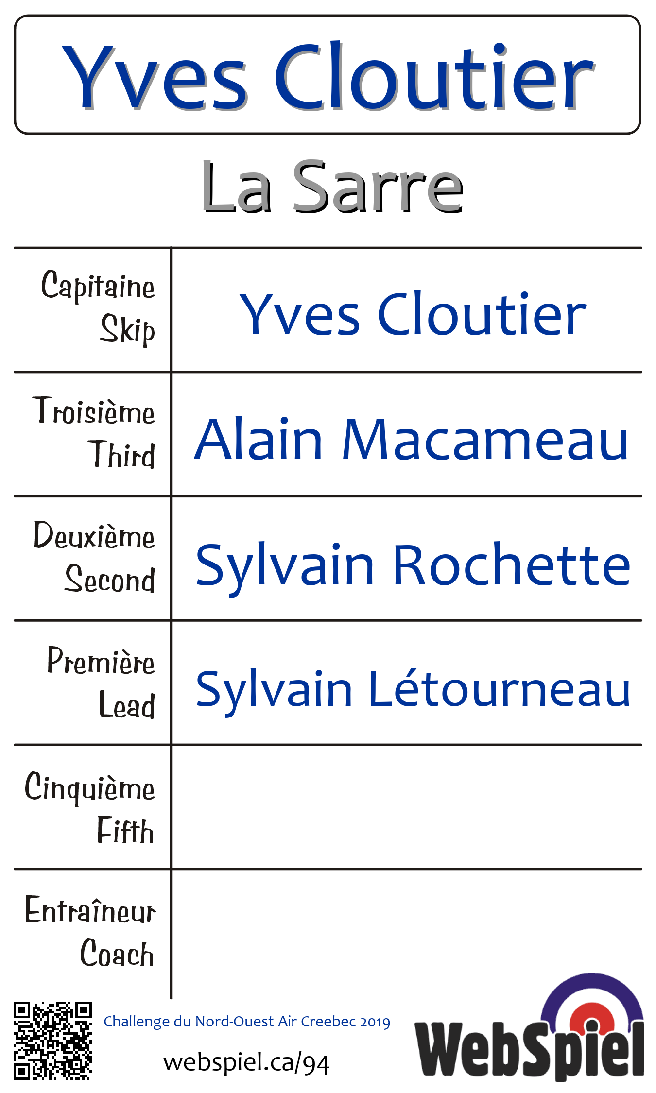 Samedi le 2 novembre 2019, à 16h00 EDT Club de curling du Belvédère, Glace 1 · A | |||||||||